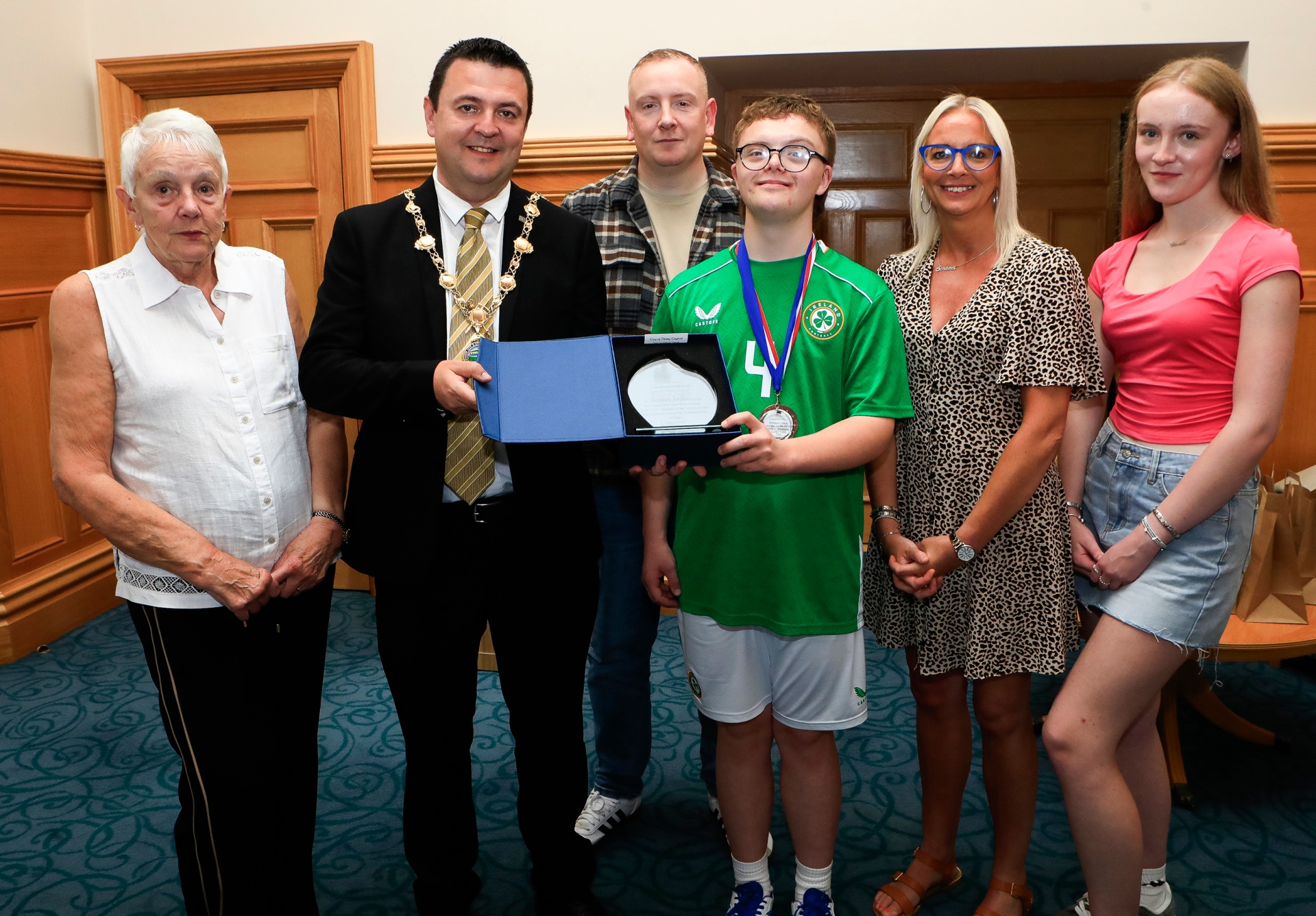 Mayor Ruairí McHugh presents a commemorative plaque to Keigan Taylor. Included are his grandmother, dad Graham, mum Serena and sister Sara.